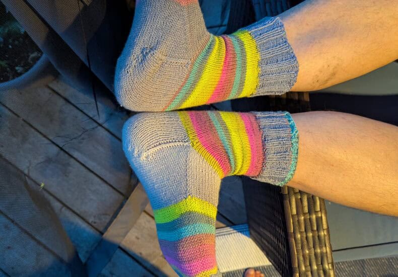 If you can believe it, I still have a huge bin a sock yarn so, I keep knitting away – combining colours, self-striping yarn and using my tried-and-true pattern (mostly located in my head now). I often sit on the front porch in the morning and due my required number of rows (I plan out