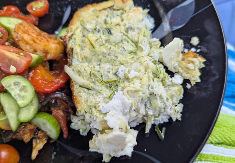 Zucchini season is upon us – there is more to zucchini than muffins or bread! Try this light, protein-packed casserole made with grated zucchini, creamy cottage cheese, salty feta, and dill (fresh or dried). You can eat this warm or cold!1 cup of cottage cheese1/2 cup of crumbled feta cheese3 large eggs (I used 4