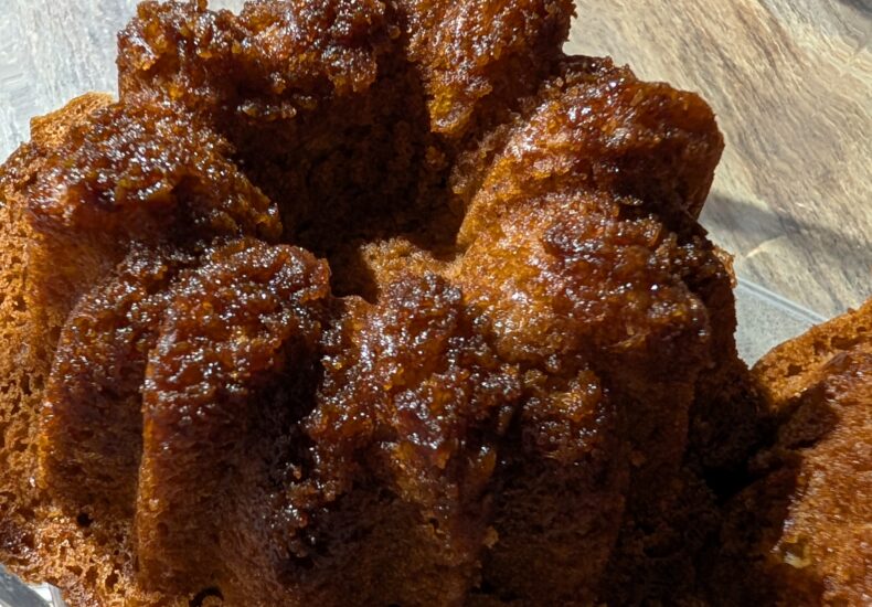 I bought some fancy new baking pans over Christmas and so I wanted to try a new recipe. This apple cake is gluten free and still fluffy, moist and full of apple pieces. The spice mix is perfect – cinnamon, nutmeg, and cloves. This cake is both delicious and easy. Grease or butter your pain