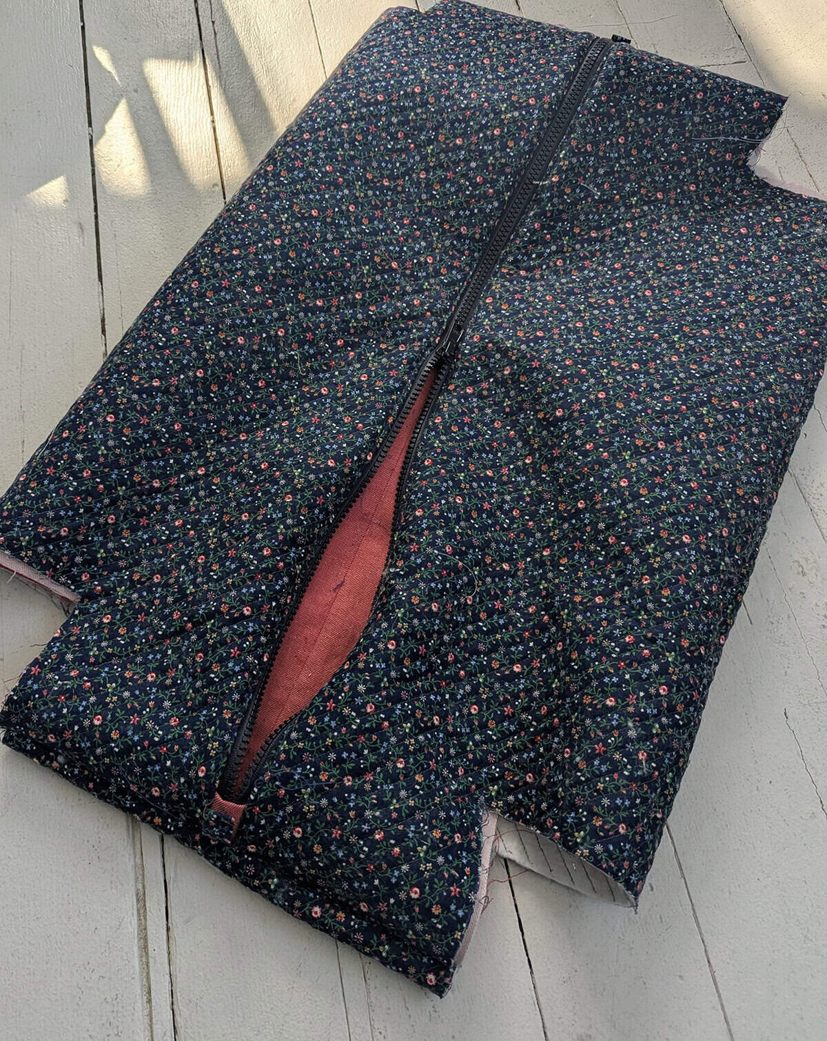 We took the measurements of the Airwrap and of the accessories that come with it and decided we would make a boxy pouch. For a bit of firmness, lightweight iron-on interfacing was joined to the denim fabric and the floral was top-stitched on quilt batting in diagonal lines that are 0.5 inch apart from each other.