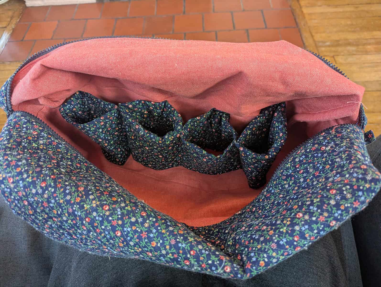 You can see the pouch with the corners cut here. Jan’s video teaches how to make French seams for these corners which end up creating the box shape and keep all raw edges invisible.