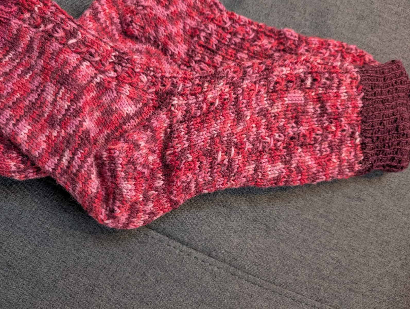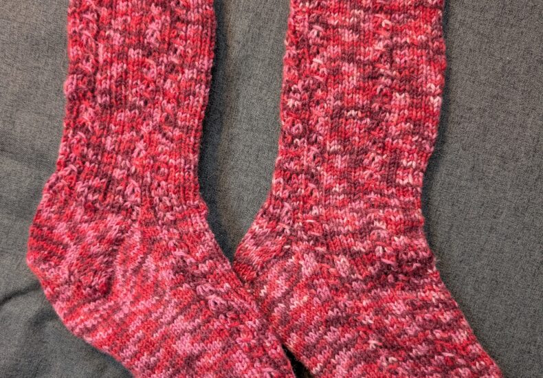 I am really enjoying this new sock pattern. This time, I made the largest size. I love the pattern – it is called the hibernal stitch pattern and it is a 4 row repeat. This is also a top town pattern – it starts at the cuff and works its way down to the toe. For the last few years, I have been knitting toe up socks so, the change is nice. This pair turned out really amazing – I will be doing this pattern for a bit.