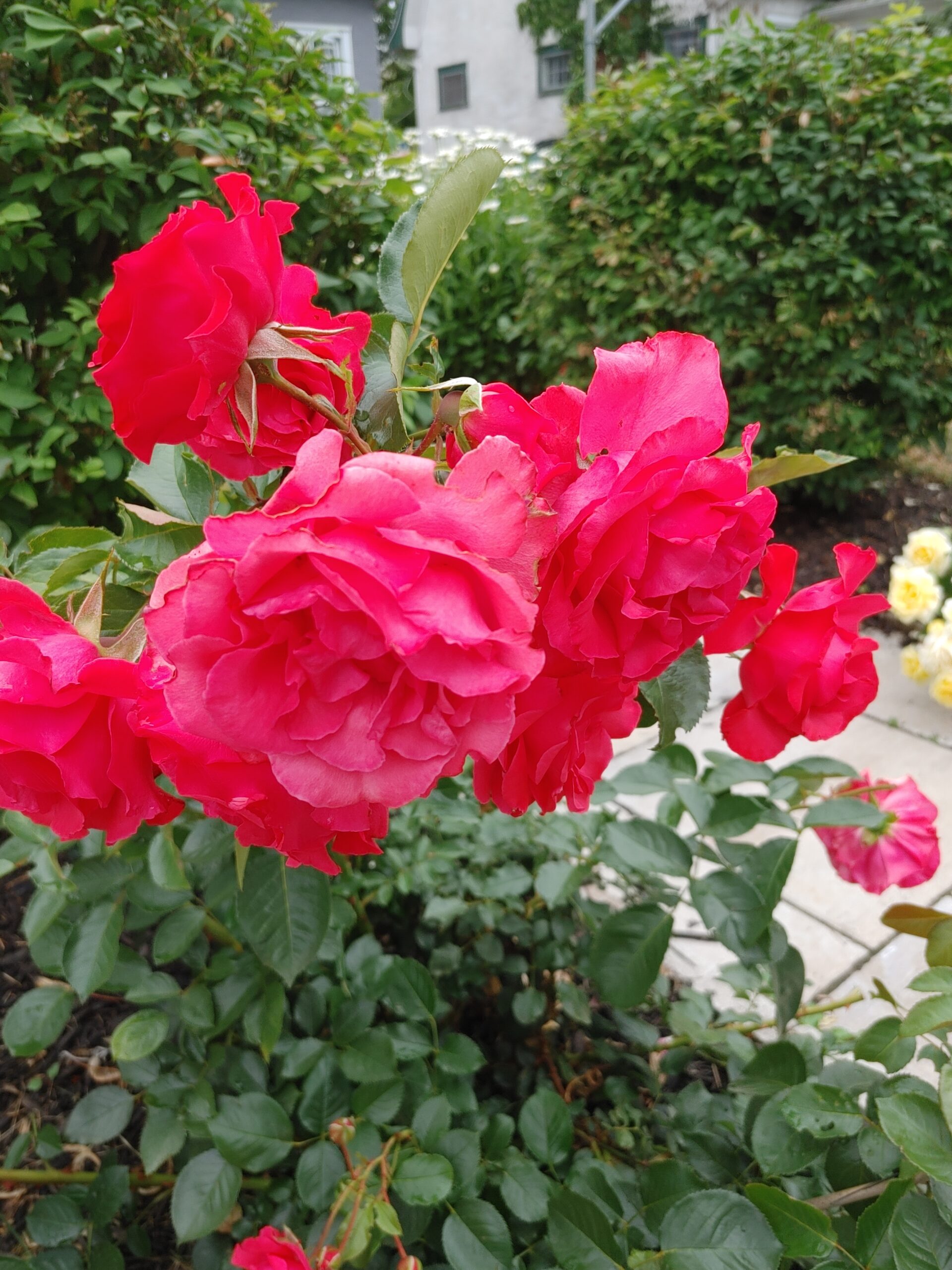 In late October or early November, I pick the final blooms and prune back my roses. I cover them with leaves and place a plastic pot over them…held down with bricks. This keeps them safe all winter.