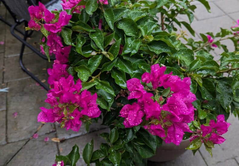 I have had two bougainvillea plants since living here. The first lasted 4 years, coming in the house for winter and back out by the pool for summer. This plant is my second and it is enjoying its second summer outside by the pool. My first plant would take all summer to bloom; however, this
